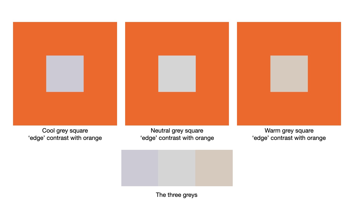 Warm colours seem warmer on cool backgrounds, and vice versa. In the image above, the internal edge around the grey squares appears to move from more to less electric as the grey warms up, with the edge around the final (right hand) square less dramatically jarring because both the orange and the grey are warm.