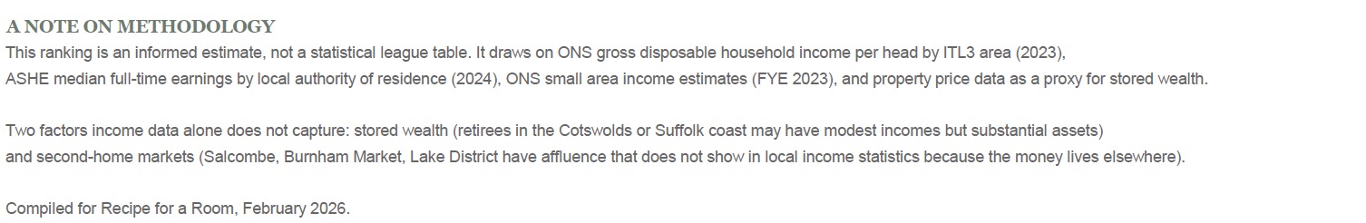 PS The AI assistant that helped to compile this report also considered but excluded places like Leeds (affluent suburbs like Roundhay exist but the density is diluted across a large city), Manchester (similar story - Hale and Didsbury are wealthy but the city-wide picture is mixed), and Cornwall (Rock and Padstow have money but it's extremely seasonal and thin).
