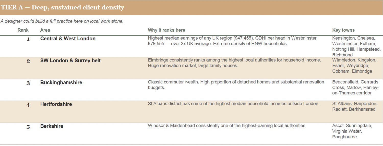 Where in the UK are there enough affluent households, concentrated closely enough together, to make running a residential interior design practice a genuinely viable commercial proposition?