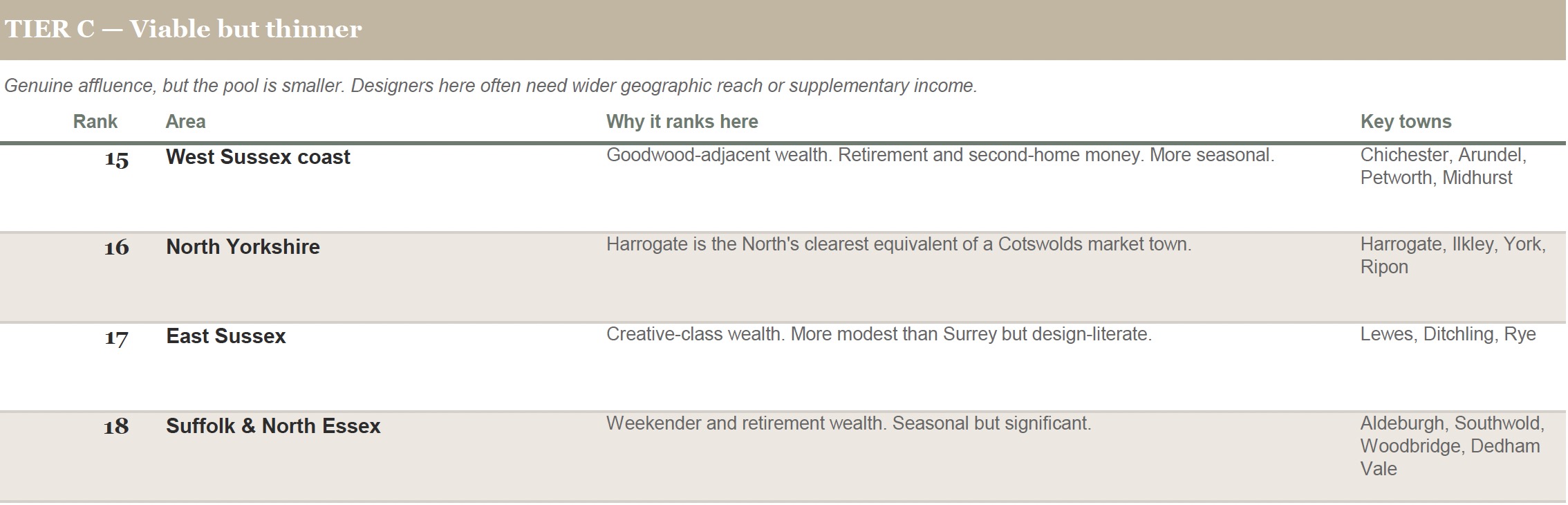 Tier C (ranks 15-27) in these locations designers may need to become creative in terms of the services and products they offer, and the argument for decoupled income becomes most pointed. These are places with real wealth - sometimes extraordinary property values - but the client pool is thin, seasonal, or dependent on a single industry. A designer based in Salcombe or Windermere faces a fundamental problem: brilliant work is possible, but the maths of one-to-one practice is precarious.