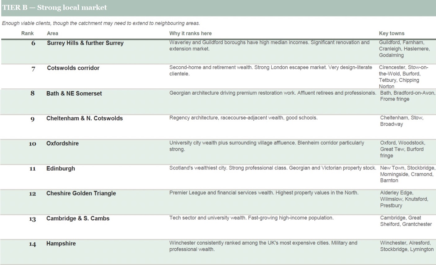 Tier A (ranks 1-5) are places where a designer could fill their diary from local referrals alone. The density of £50k+ households is high enough that the market sustains multiple practices in competition.