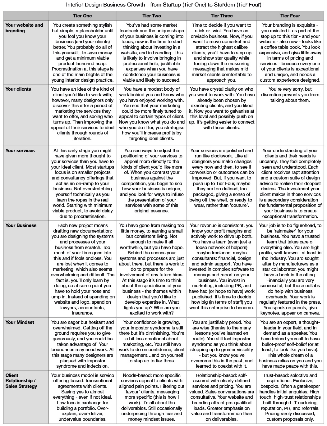 The Tier framework I teach, maps interior design business maturity across four stages: from startup (Tier One) through growing pains (Tier Two) and into maturity (Tier Three) and, for those who choose to pursue it, stardom (Tier Four). Each tier has a distinct profile: different clients, different services, different systems, a different mindset, and - critically - a different marketing logic.