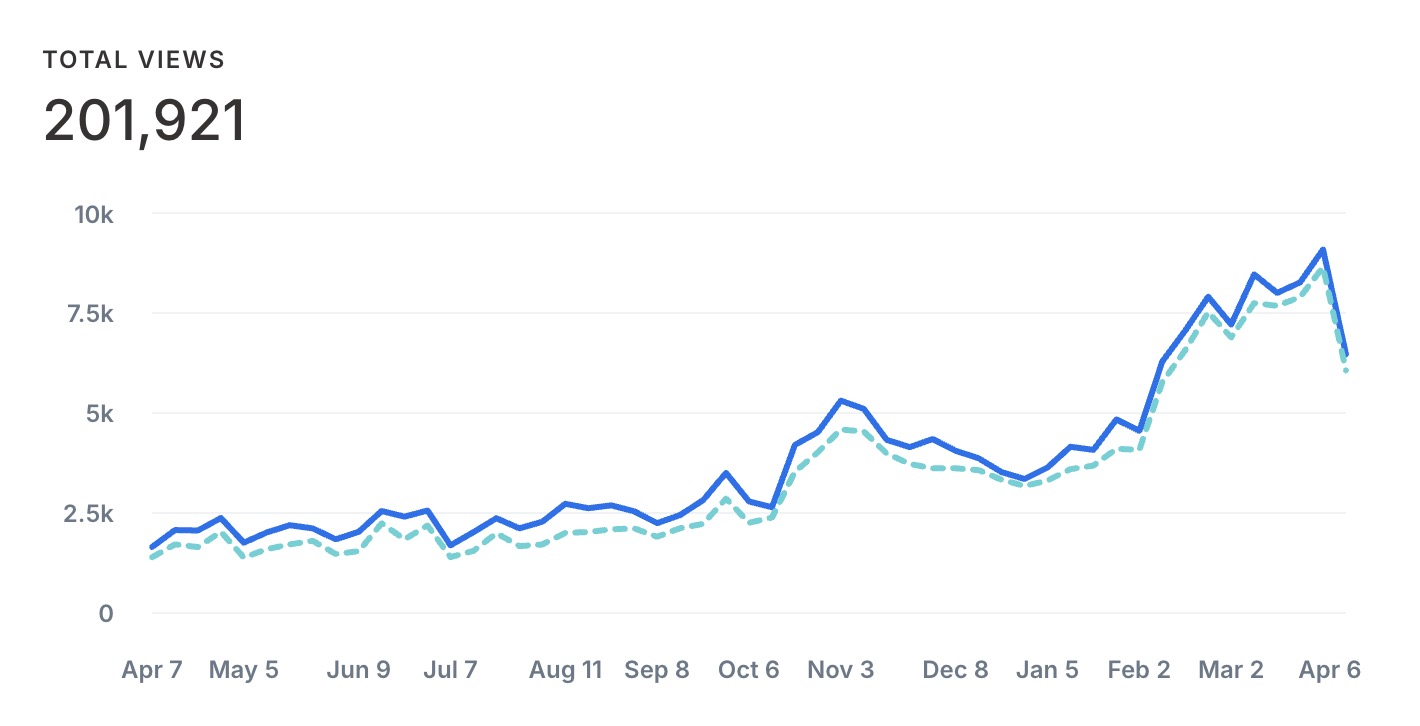 After a jump up last autumn, they ended 2025 at roughly 5,000 per week. There was a Christmas dip, but in the first quarter of 2026 they have doubled again, to just under 10,000 per week (my next goal 💪). I have not run paid advertising. What I have done is publish a blog and a newsletter, every single week, for over a year, without exception. The chart is a persuasive argument for the compounding effect of consistent content production. Note: the growth really kicked in after 10 months of slog.