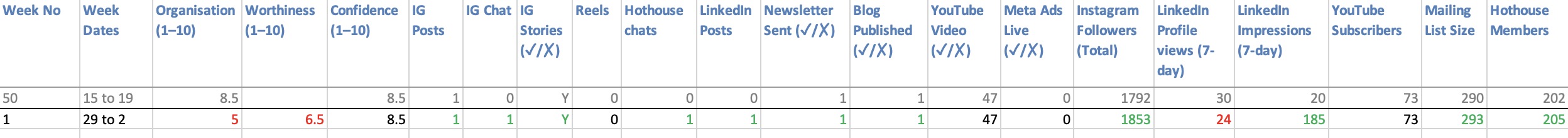 I was fond of version one, but my year-end business review made something very clear: I need to capture more data, more regularly, if I want a truly accurate picture of how the business is developing. What Iām sharing here is sheet one. Thereās a second, private sheet where I track client acquisition activity, sales conversion, and revenue by product. Iāll update both parts weekly, watch trends monthly, and review strategy quarterly.