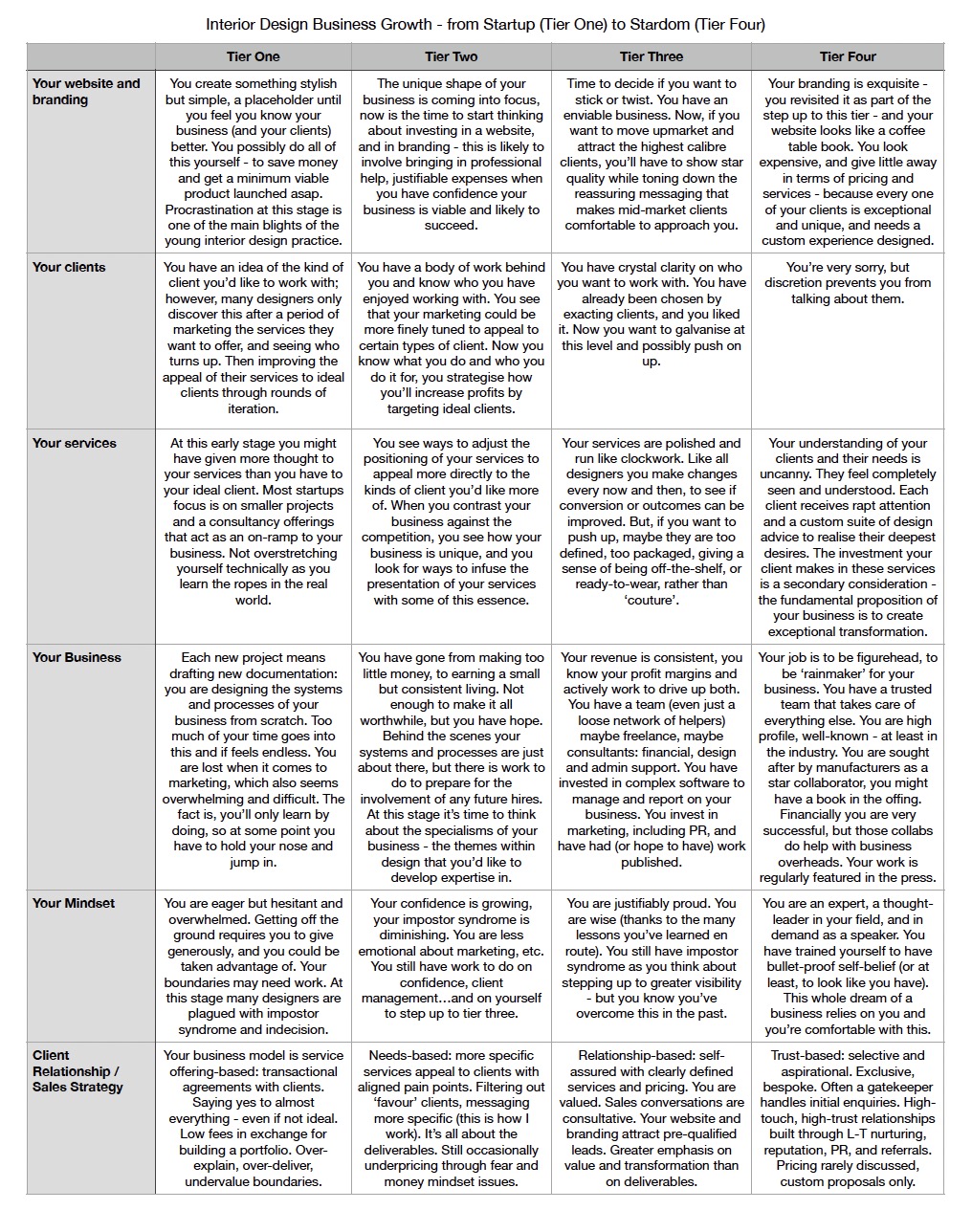 At the heart of my work is a theory of interior design business evolution. Over time, practices move through four distinct tiers - Startup, Growing Pains, Maturity, Stardom - each with its own challenges, mindset shifts, and growth opportunities.