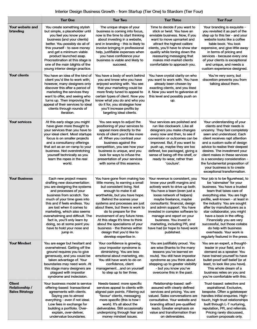 I’ve developed a four-tier model of residential interior design business, “From Startup to Stardom”, to help you benchmark your business honestly and see your next steps clearly. To help you plan the intentional growth of your business.